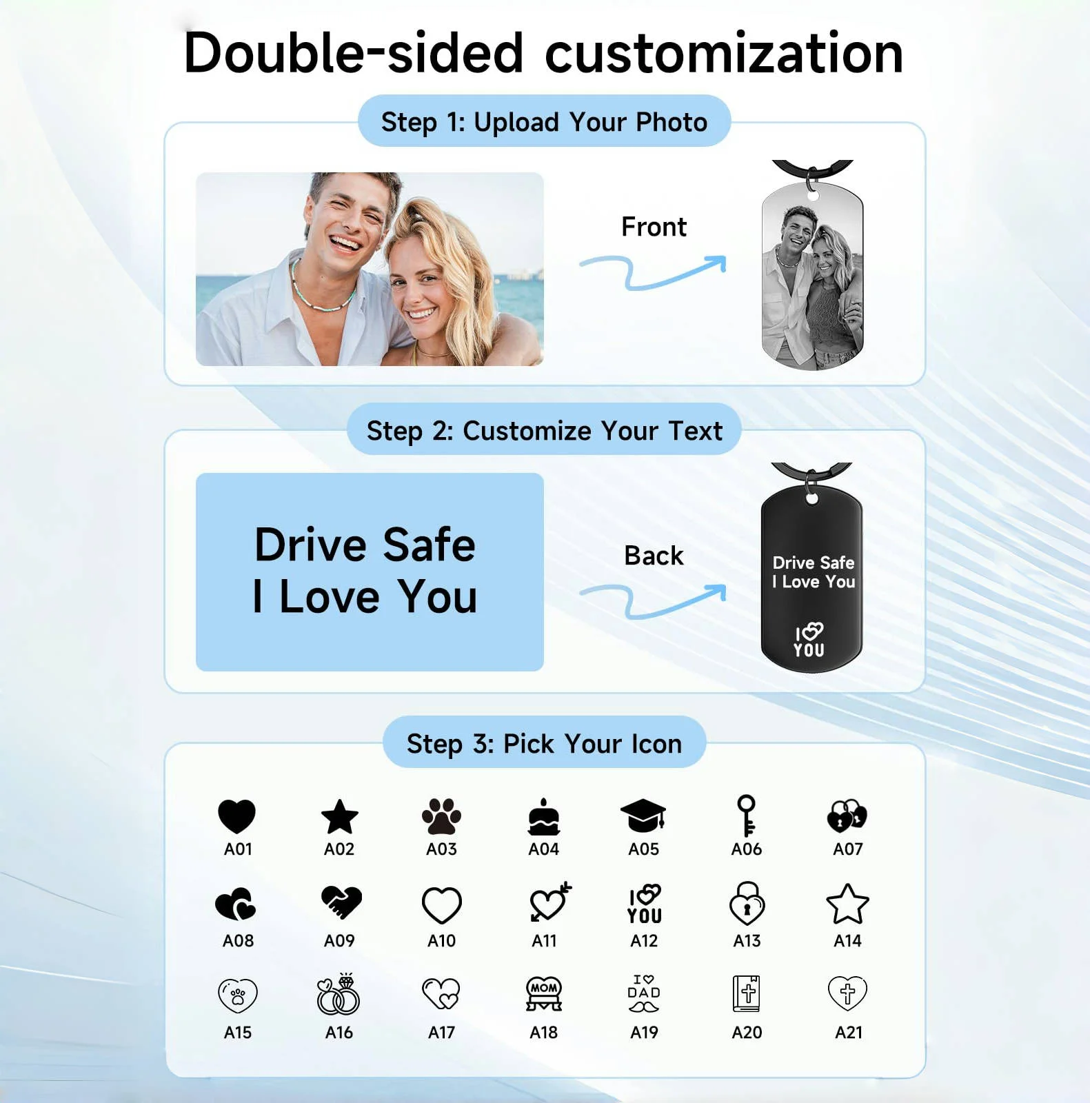 Keep your most cherished memories close wherever you go with this Personalized Photo Keychain. Made from premium stainless steel, this elegant accessory allows you to customize it with a photo and text โ€” perfect for capturing special moments with your partner, family, or pet.